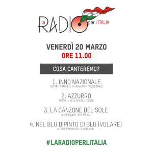 Venerdi 20 marzo alle ore 11 tutte le radio trasmetteranno l’Inno di Mameli e tre canzoni che hanno fatto la storia della musica nazionale.